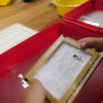 専用の木枠でパルプ液をすいて和紙風のはがき作りに挑戦!