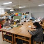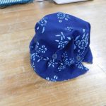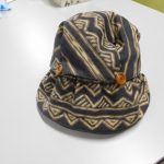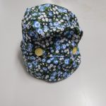 リユース品の古布を使ってつばをボタンで留めたデザインの帽子を製作しました。